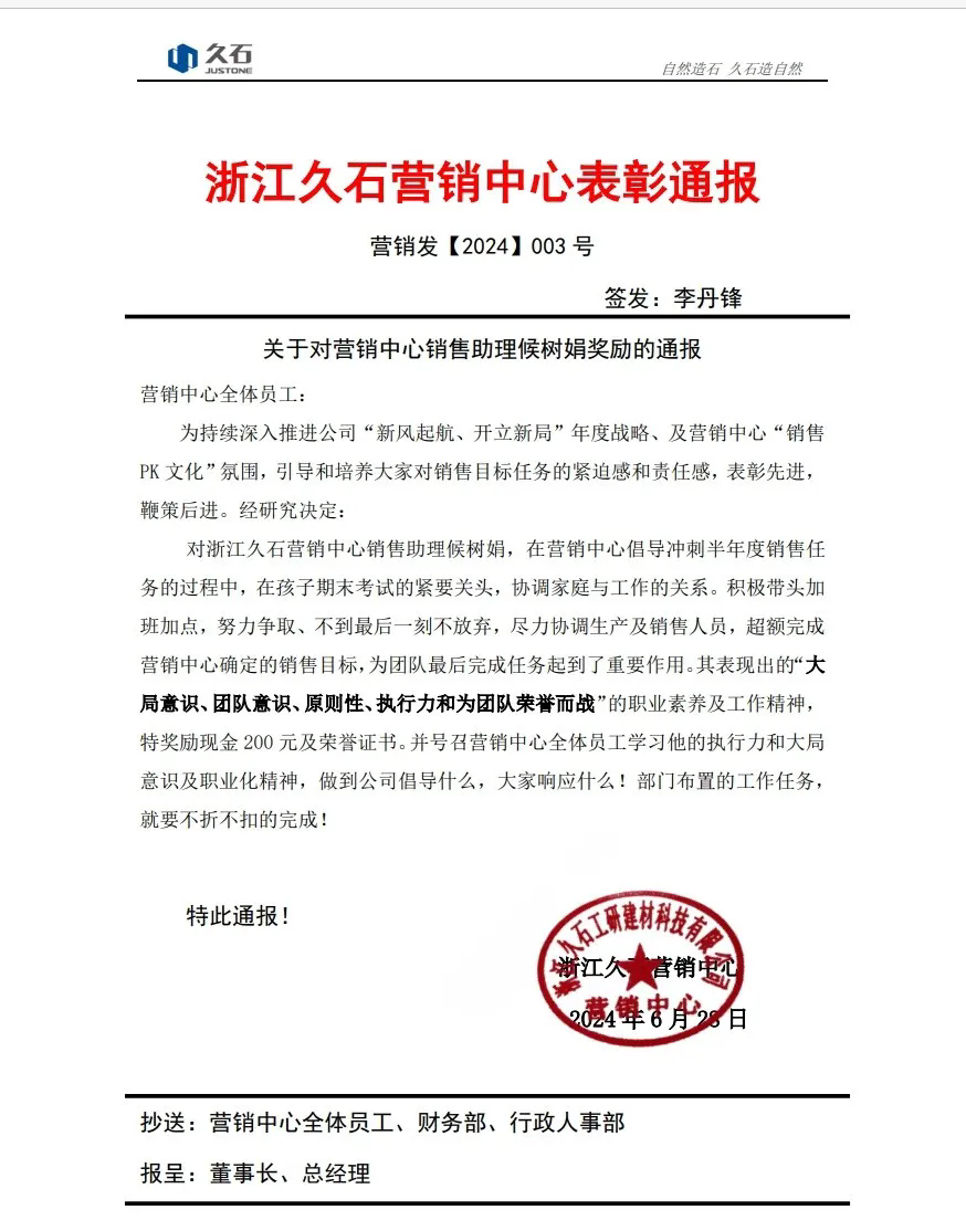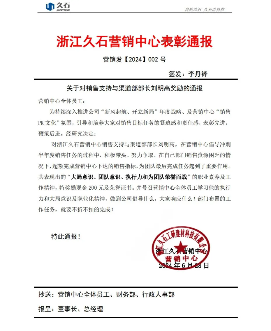 2024年上半年,久石銷(xiāo)售業(yè)績(jī)?cè)賱?chuàng)新高,取得了上半年同期增長(zhǎng)78.4%、6月份同期增長(zhǎng)109%的好成績(jī)。在營(yíng)銷(xiāo)中心倡導(dǎo)沖刺半年度銷(xiāo)售任務(wù)的過(guò)程中,營(yíng)銷(xiāo)中心銷(xiāo)售支持與渠道部部長(zhǎng)劉明高、銷(xiāo)售助理侯樹(shù)娟表現(xiàn)優(yōu)異,分別榮獲200元現(xiàn)金獎(jiǎng)勵(lì)及榮譽(yù)證書(shū)。